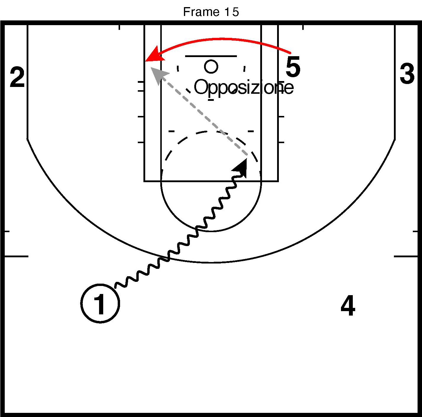 Questo taglio può essere effettuato anche dal giocatore che occupa lo spot di 5 se posizionato nel dunker spot, muovendosi in opposizione alla palla per attaccare lo spazio creato (Frame 15).