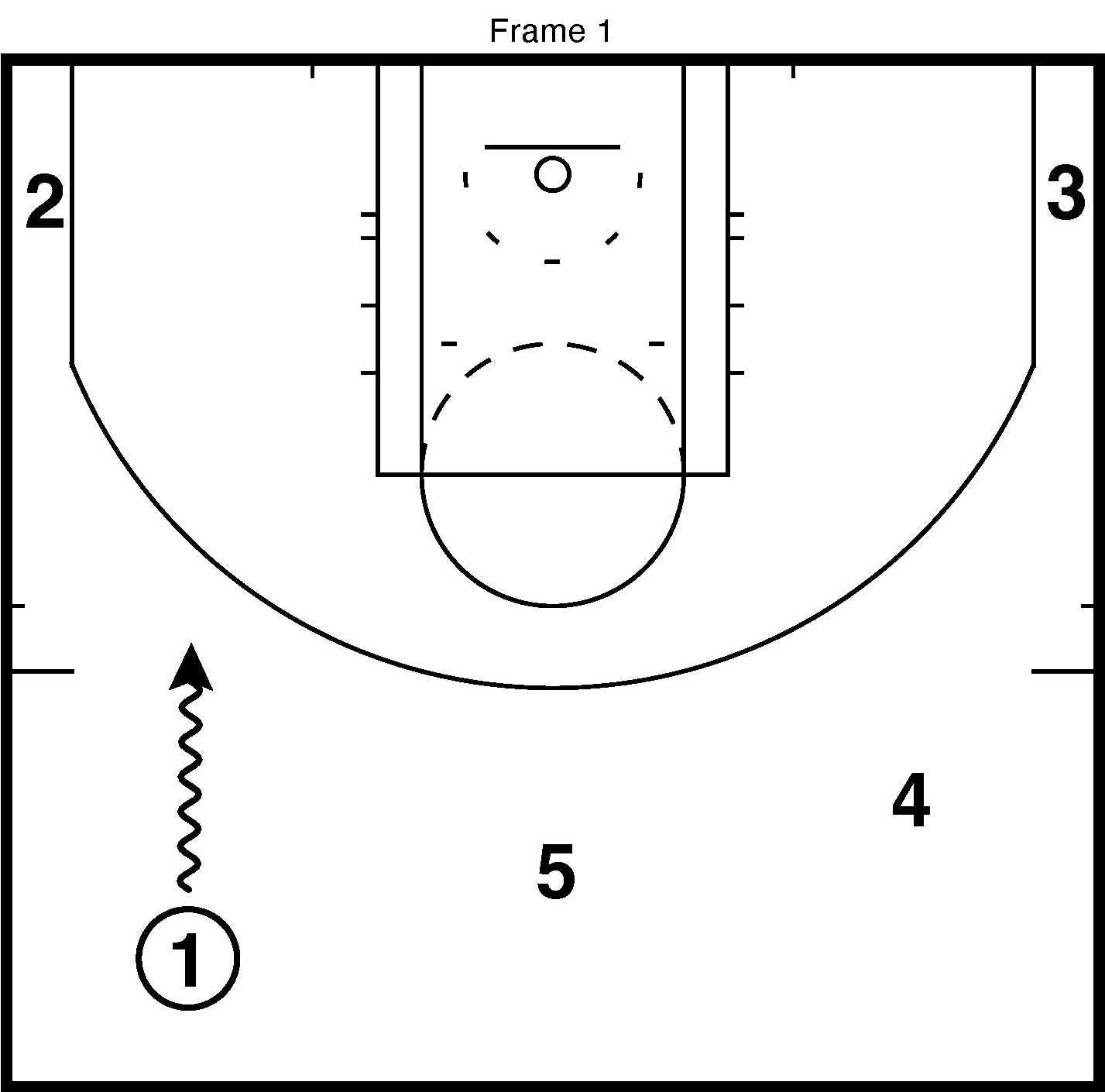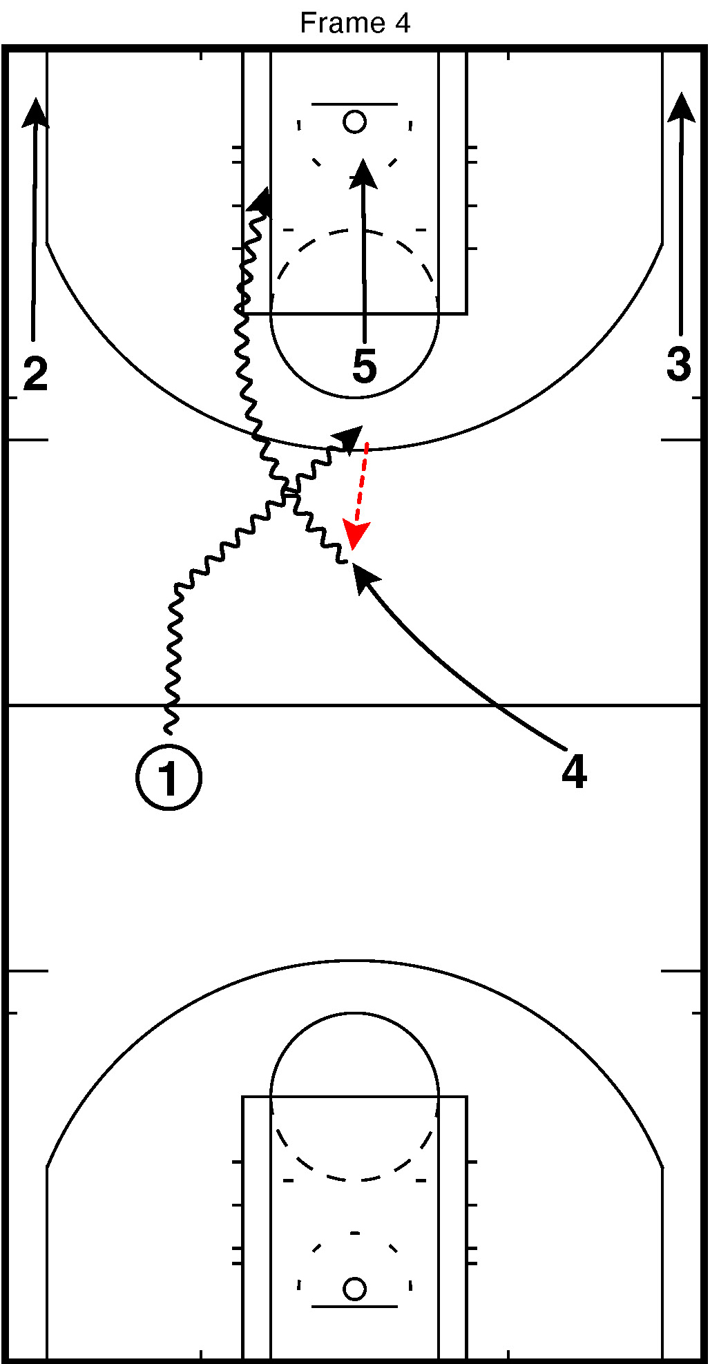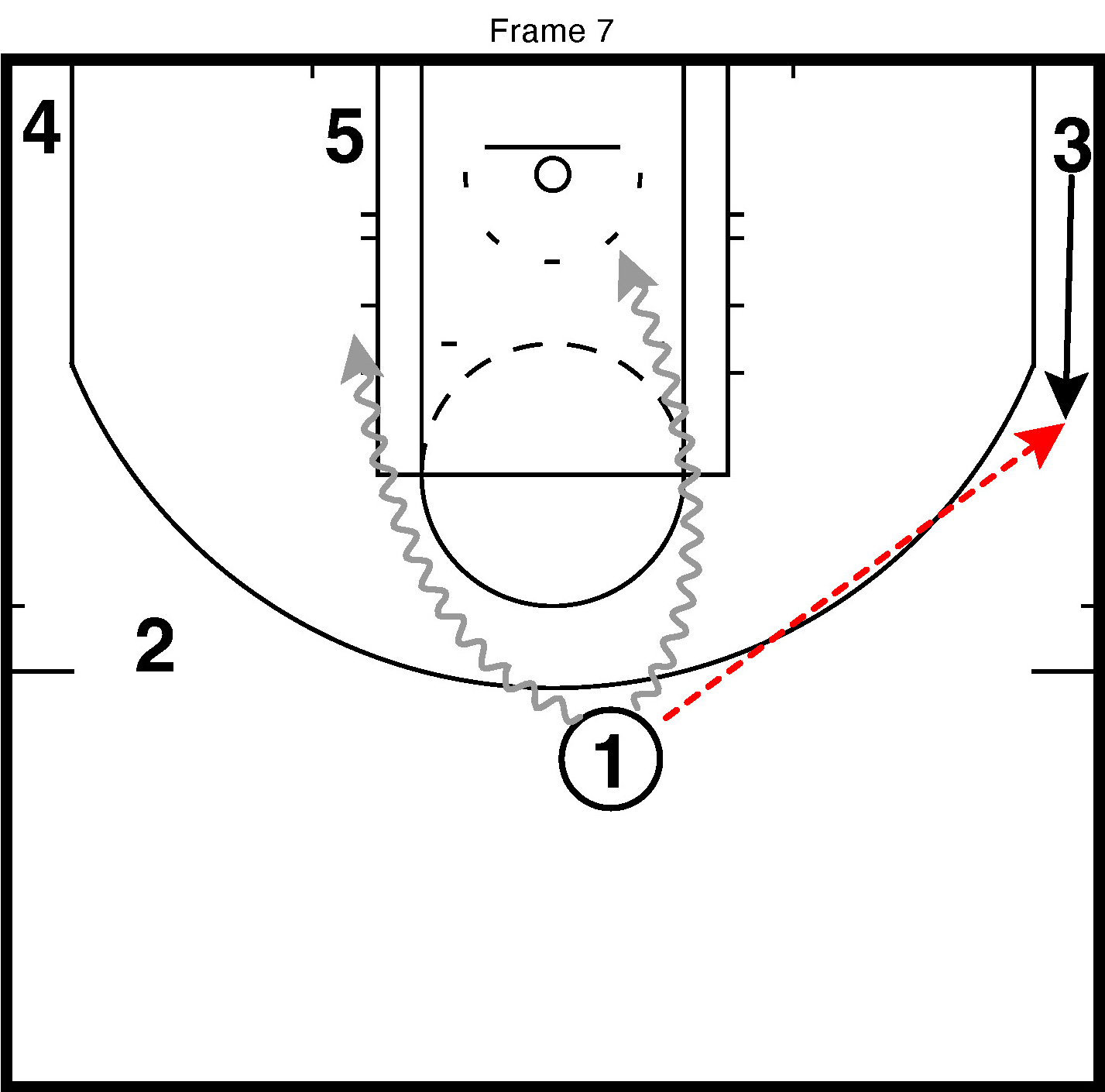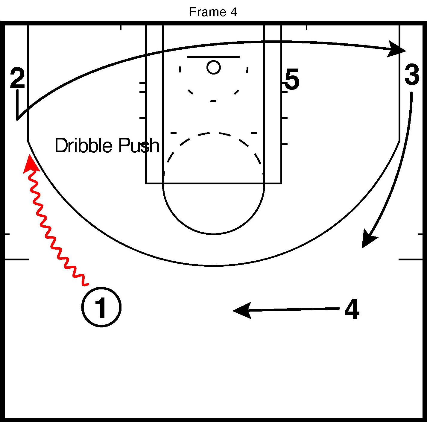 Con l’innesco "Dribble Push" (letteralmente “spingere via in palleggio”), 1 palleggia verso il compagno in ala (Frame 4), che reagisce con un taglio sul fondo, liberando il quarto di campo (Clear cut) e isolando l’1c1. Se 1 non riesce a “rompere” la difesa, è immediatamente disponibile il passaggio di sicurezza verso il safety, identificato nei diagrammi come 4 che si accentra (Frame 5).