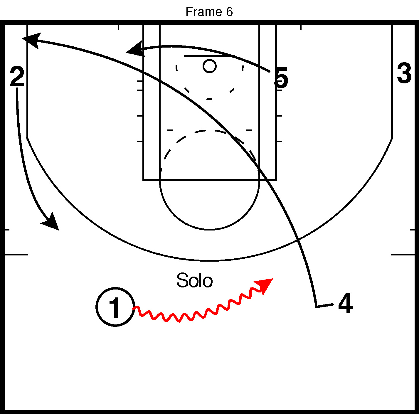 Se 1 palleggia verso il centro invece l'innesco si chiama "Solo". Anche l’opzione "Solo" è un espediente della Dribble Drive Motion offense, quando l’attacco crea una situazione di singola guardia sul punto di attacco per aprire double e financo triple gap. In questo caso, 1 si sposta in palleggio verso il centro del campo (Frame 6), attivando: