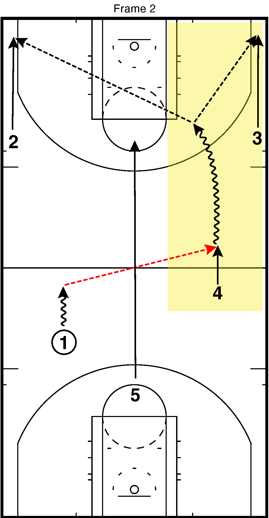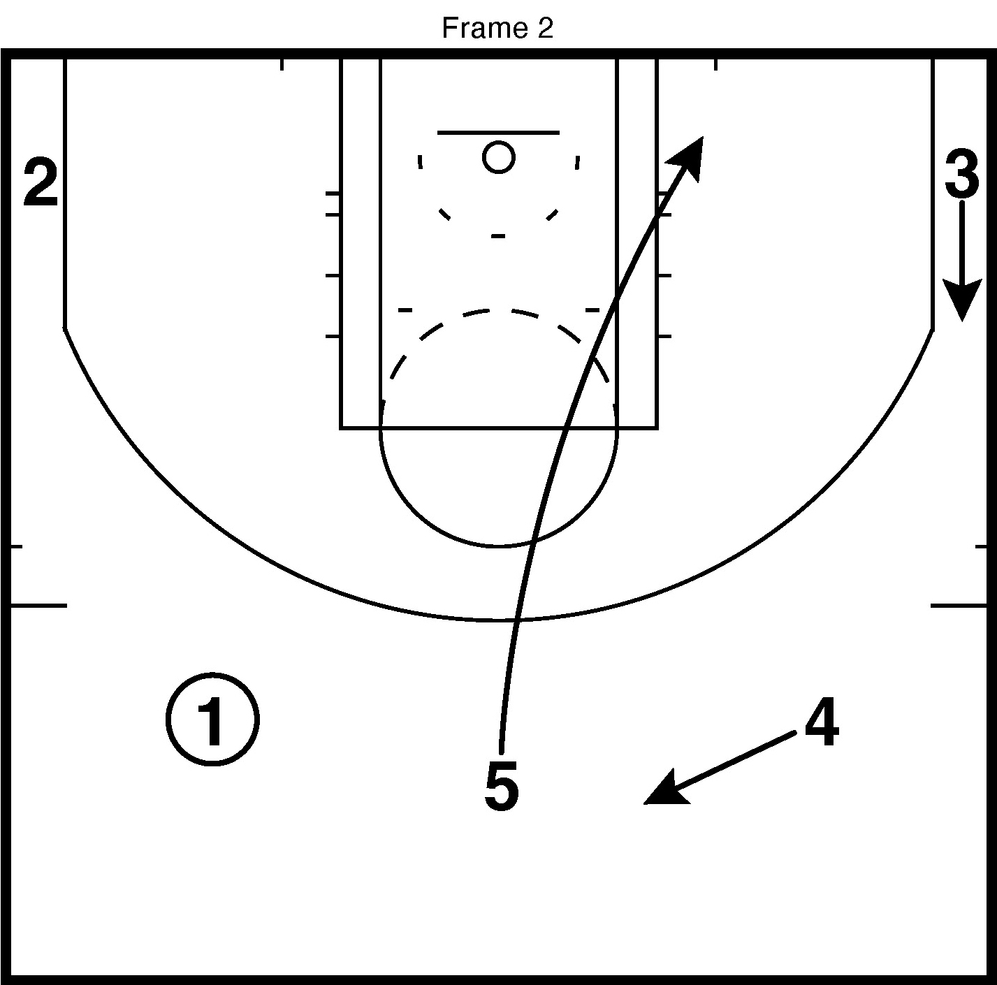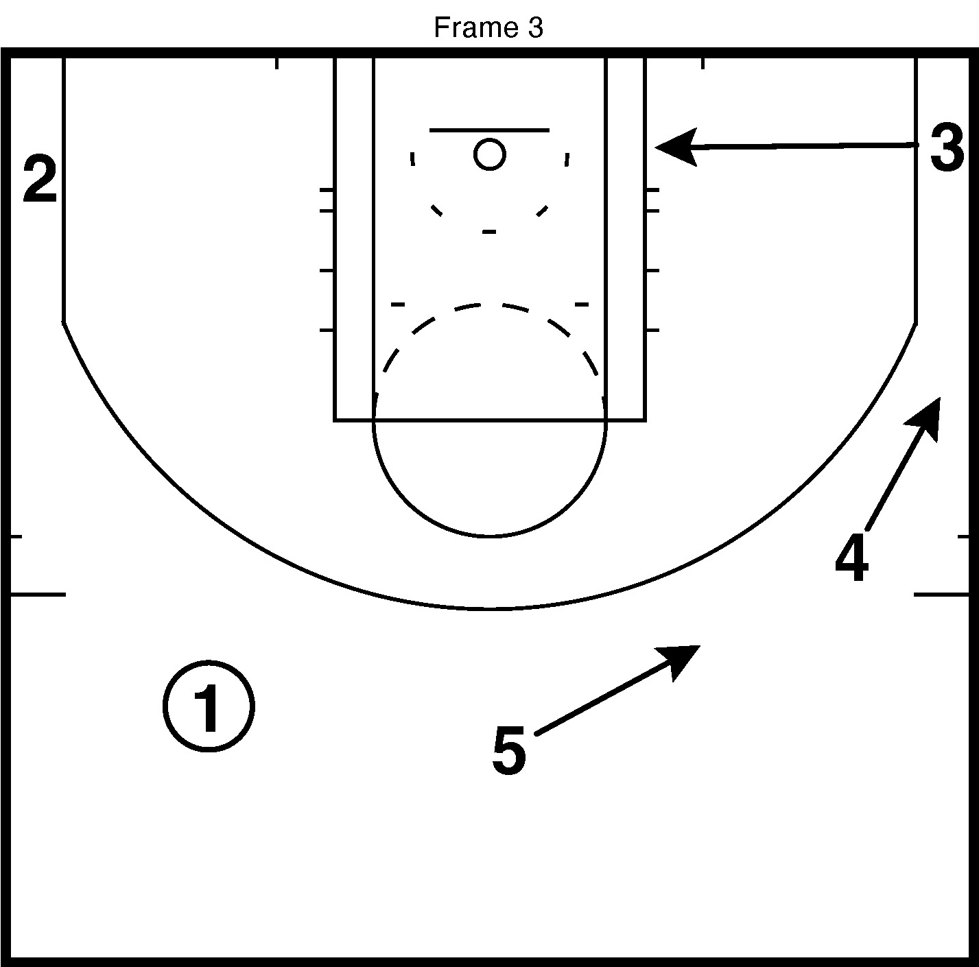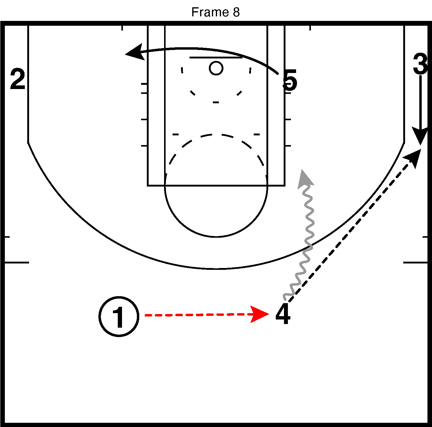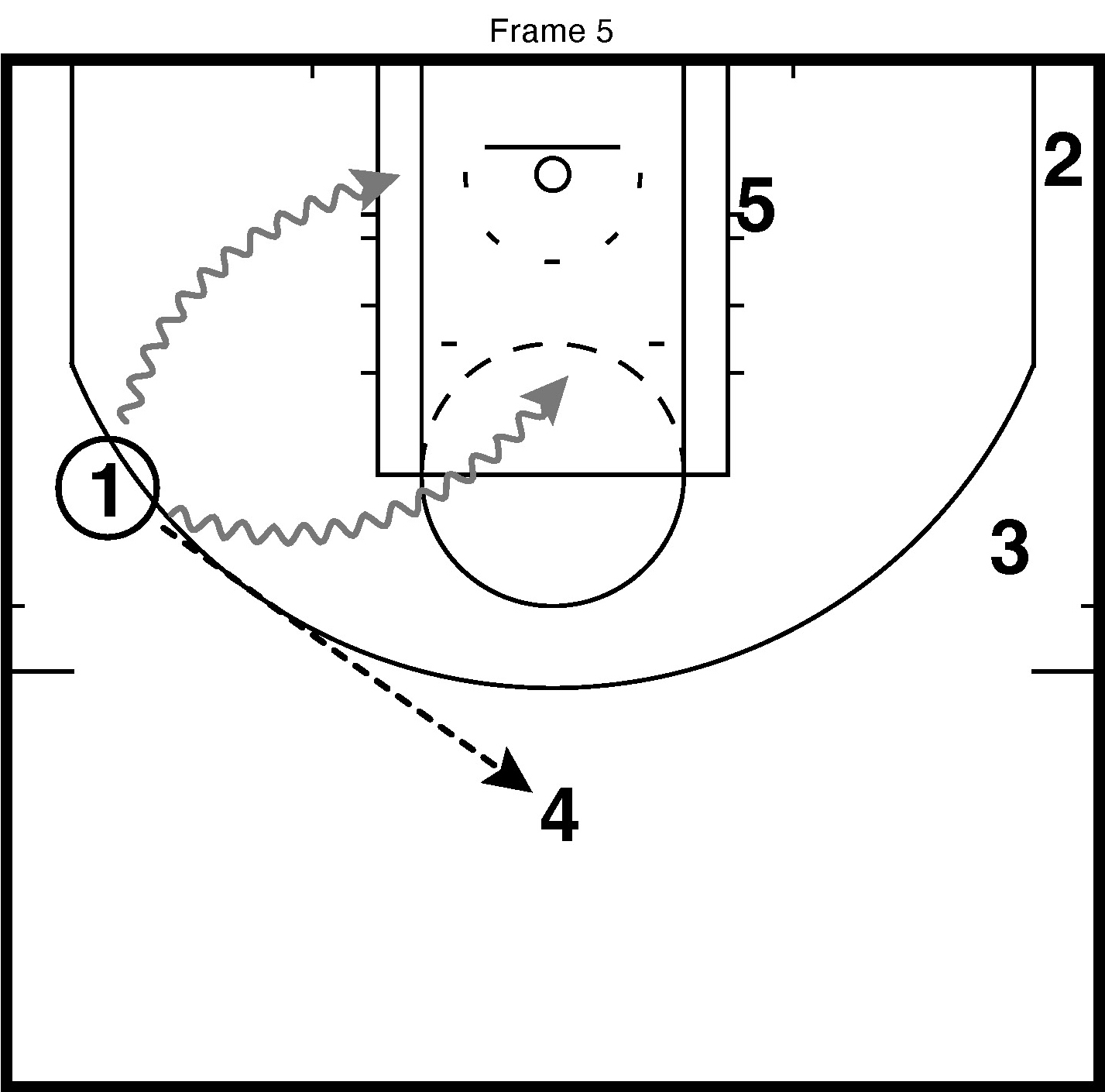 Con l’innesco "Dribble Push" (letteralmente “spingere via in palleggio”), 1 palleggia verso il compagno in ala (Frame 4), che reagisce con un taglio sul fondo, liberando il quarto di campo (Clear cut) e isolando l’1c1. Se 1 non riesce a “rompere” la difesa, è immediatamente disponibile il passaggio di sicurezza verso il safety, identificato nei diagrammi come 4 che si accentra (Frame 5).