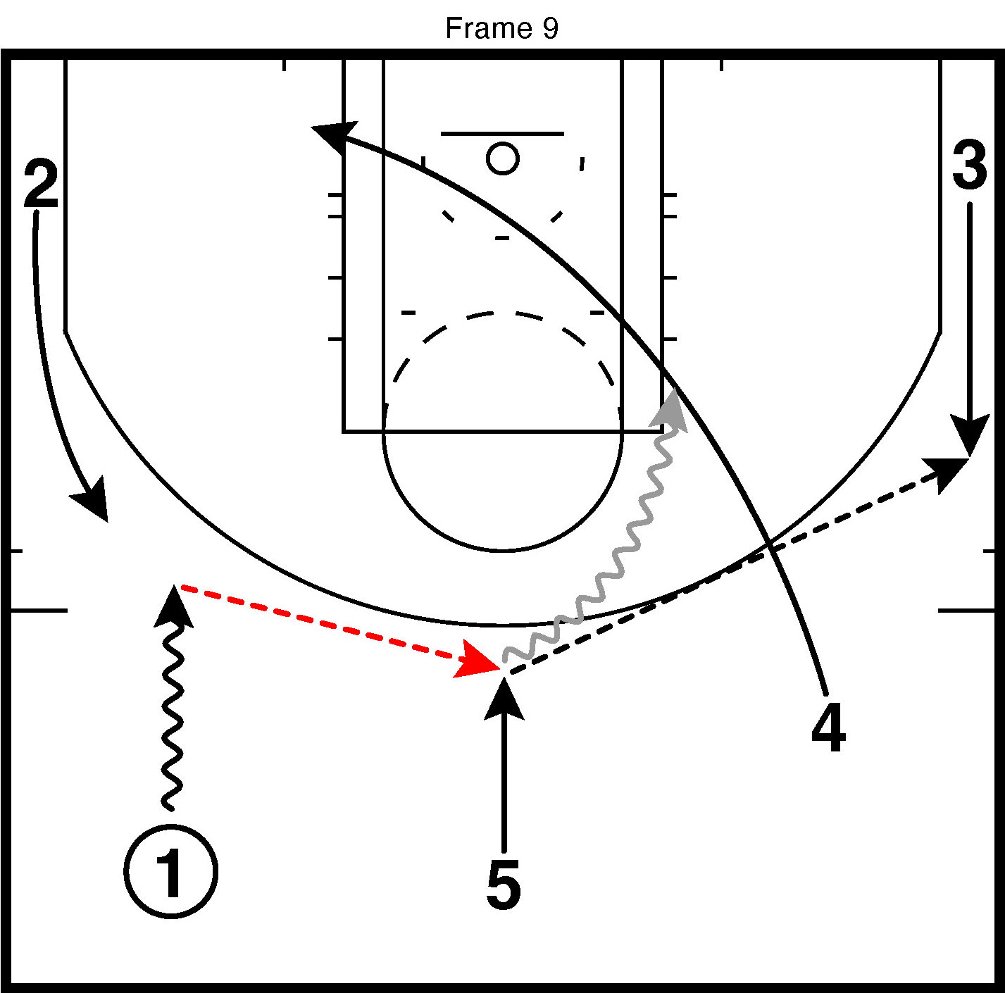 - 5 ha corso come rim-runner nel dunker spot e si riloca immediatamente nel dunker spot opposto (Frame 8).