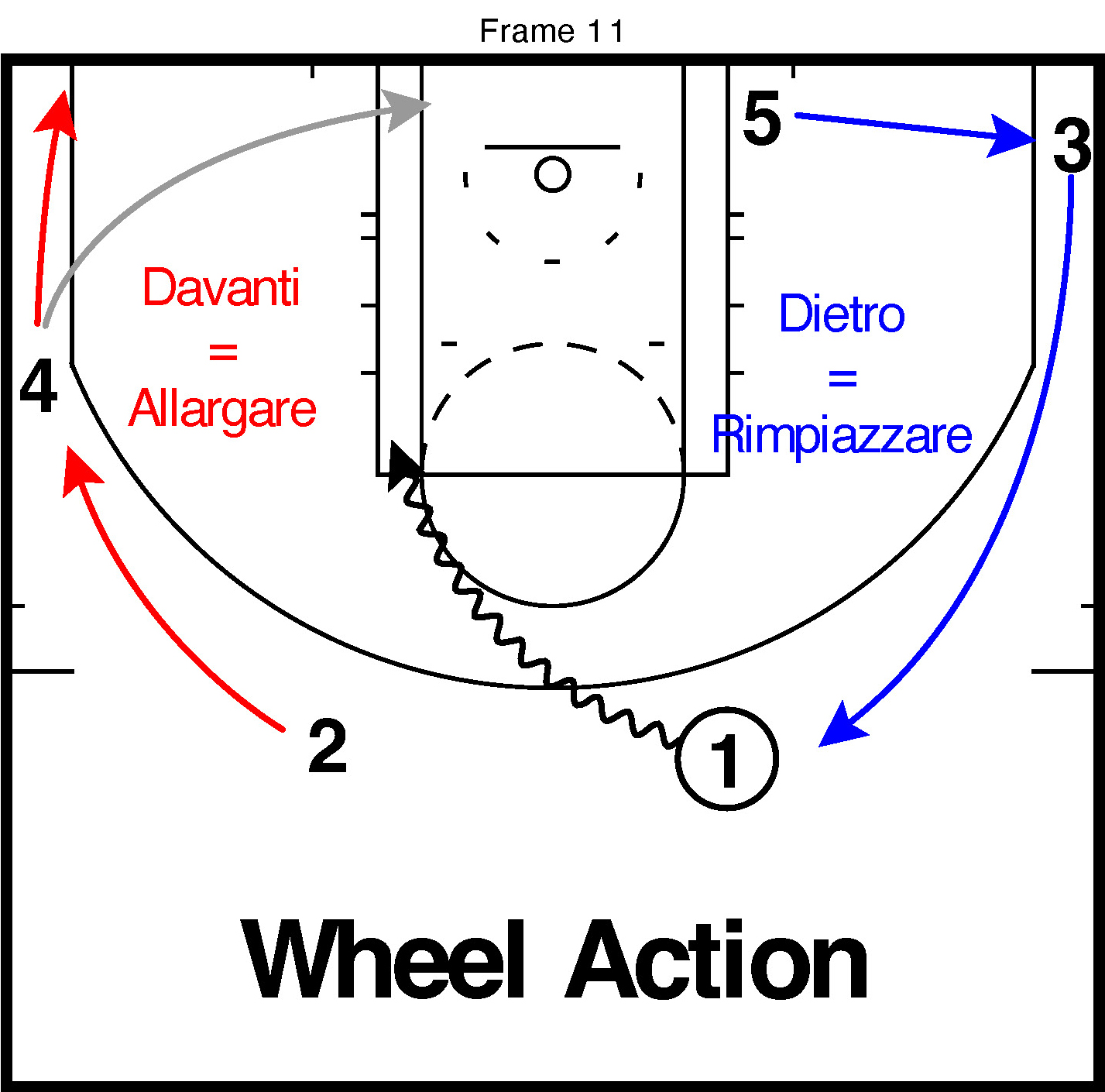 Il movimento off the ball dei giocatori senza palla in funzione alla penetrazione, viene organizzato attraverso la Wheel Action (Frame 11). Questa consiste in una rotazione dei giocatori perimetrali nella stessa direzione presa dalla palla, con l’obiettivo di “stretchare” la difesa per eliminare stunt e aiuti davanti alla palla con gli scarichi in visione ("Drift cut"), allo stesso tempo, garantire un rimpiazzi dietro la penetrazione per offrire il safety pass.