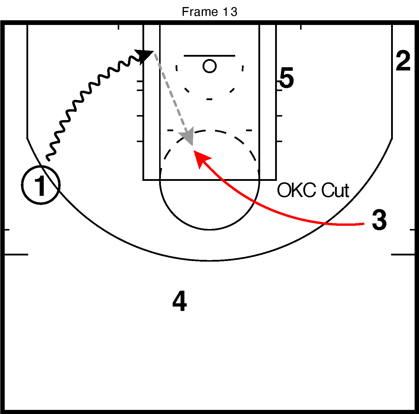 1. Tagli a canestro verso il centro su penetrazioni laterali (nella terminologia di Vance Walberg: lane drive). Il taglio più semplice, di stampo classico Dribble Drive Motion, è il movimento in opposizione verso il centro del giocatore posizionato nel dunker spot (Frame 12), concepito per punire direttamente l’aiuto difensivo del lungo (x5). Il taglio “evoluto” è invece quello del giocatore a 45° sul lato debole (Frame 13), noto come OKC Cut, diventato uno dei capisaldi dell’attacco degli Oklahoma City Thunder campioni NBA.
