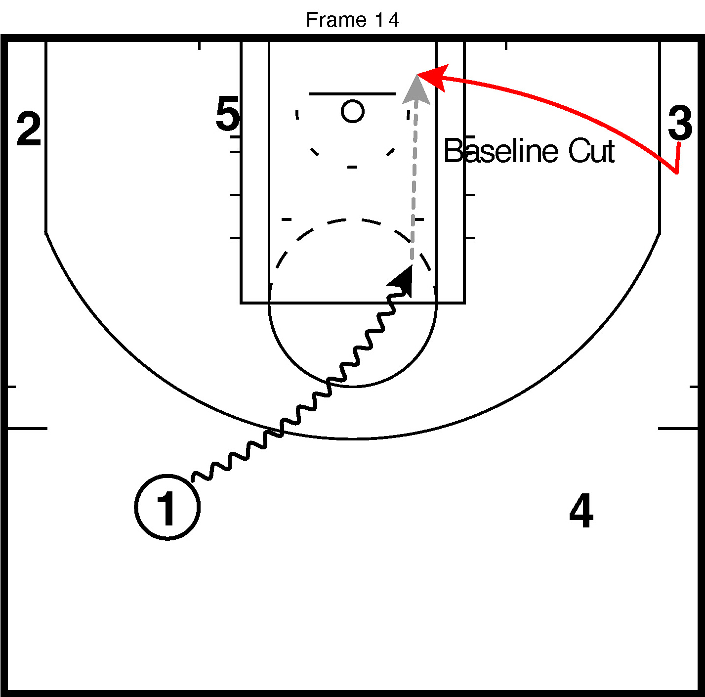 Questo taglio può essere effettuato anche dal giocatore che occupa lo spot di 5 se posizionato nel dunker spot, muovendosi in opposizione alla palla per attaccare lo spazio creato (Frame 15).