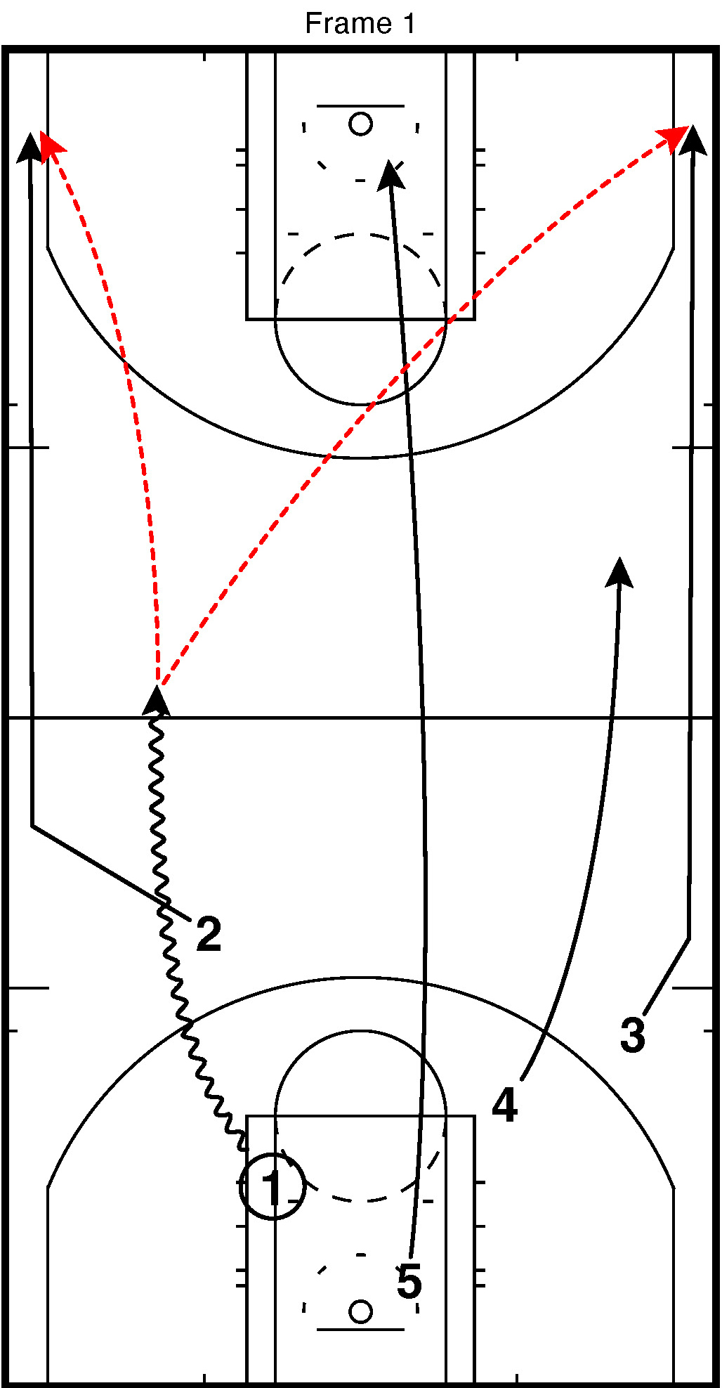 2. 2-Sided Break (Frame 2): Trasferimento della palla incrociando il campo sul lato debole, dove corrono due giocatori. È un concept oggi molto diffuso ed estremamente efficace contro le difese che rientrano chiudendo le corsie centrali.